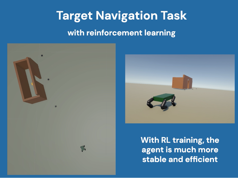 I used Unity to build a quadruped model and trained it with reinforcement learning to walk with fast and stable gait. I also trained it to perform a target navigation task. It uses a central pattern generator and modulates joint angles with a recurrent neural network to overcome internal and external perturbations.